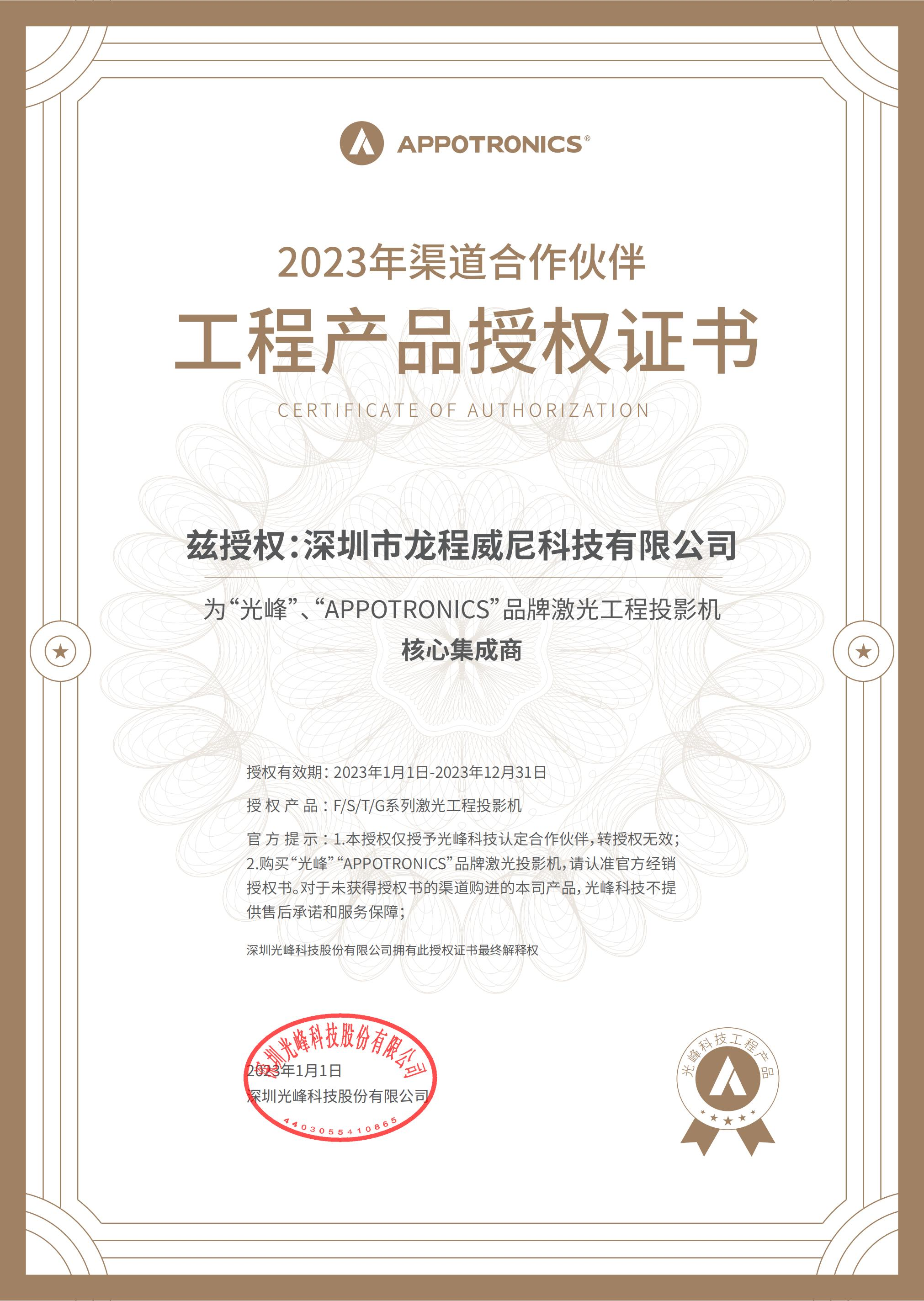 公司被授权为“光峰”投影机经销商